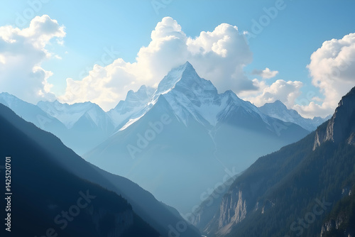 Majestic Mountain Vista, A Serene Landscape Dominated by Snow-Capped Peaks and Billowing Clouds Under a Clear Blue Sky Inviting Exploration and Awe