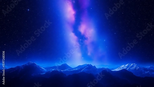 mountain, night sky, star, nebula, purple, blue, dark, space, cosmic, galaxy, landscape, nature, scenery, majestic, vibrant, serene, peaceful, calm, mystical, fantasy, cold, winter, snow, peak, ridge, astronomy, celestial, artwork, digital artwork, illustration