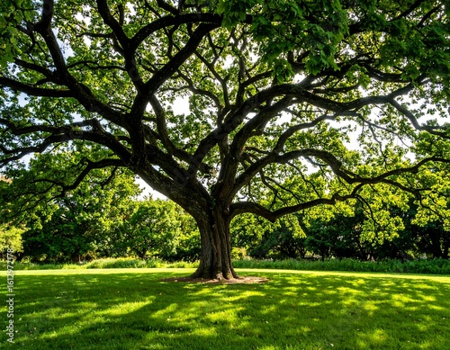Majestic oak tree in a grassy park