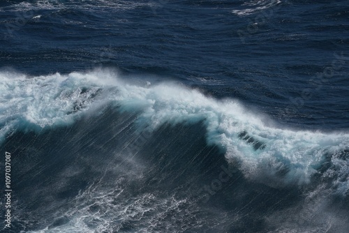 Majestic ocean waves crashing against each other, creating dynamic and powerful scene. deep blue water contrasts beautifully with frothy white surf, evoking sense of tranquility and strength