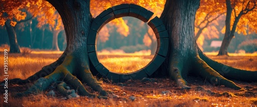 Majestic old trees with unique circular cut trunks surrounded by vibrant autumn foliage in a serene natural landscape.