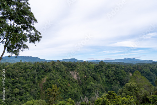 Majestic panoramic view from Panorama Baru, Bukittinggi, featuring lush green rainforests and rolling hills under a vast, partly cloudy sky, showcasing the stunning natural beauty of West Sumatra.