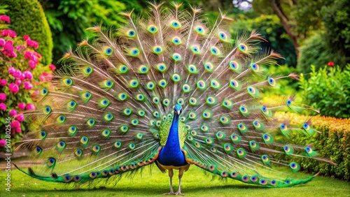 Majestic peacock displaying vibrant tail feathers in a beautiful garden, peacock, feathers, vibrant, majestic, garden, wildlife