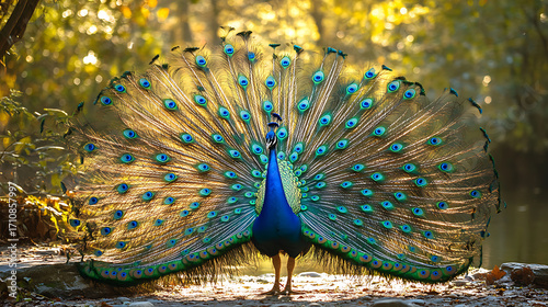 Majestic peacock displays its vibrant, iridescent feathers in fan shape, showcasing bright blue, green, and gold hues against natural forest background with warm sunlight