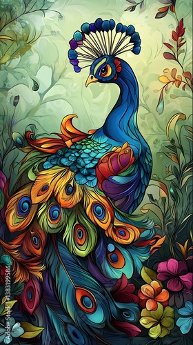 peacock, bird, feather, flower, colourful, vibrant, illustration, art, digital, nature, wildlife, animal, tropical, exotic, beautiful, elegant, ornate, detail, pattern, design, graphic, painting, drawing, colours, palette, high-coloured, bright, peafowl, plumage, iridescent, tail, crest, garden, bloom, foliage, botanical, jungle, fantasy, artistic, showy, magnificent