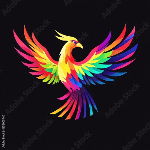 phoenix, bird, rainbow, colourful, wing, digital, art, artwork, graphic, design, abstract, fantasy, mythical, creature, powerful, majestic, vibrant, spectrum, colours, black, background, illustration, vector, image, symbol, legend, mythology, exotic, ornate, elegant, fiery, bright, artistic, visual, creation, imaginative, pride, resurrection