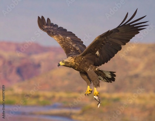 eagle, flight, soaring, wildlife, nature, bird, predator, prey, hunting, sharp, talon, wing, powerful, keen, eye, brown, gold, red, mountain, landscape, river, horizon, capture, sharpness, detail, sharpened, dynamic, aerial, beautiful, freedom
