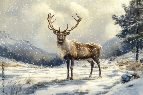 Majestic Reindeer in a Snowy Landscape Under a Winter Sky Surrounded by Snowflakes with Mountains in the Background Capturing the Essence of the Arctic Wilderness