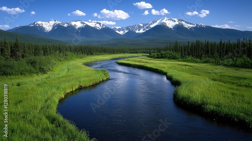 Majestic river flowing through lush green valley with snow-capped mountains nature landscape scenic view