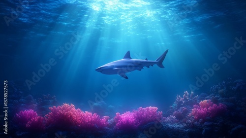 Majestic Shark Gracefully Swims Over Vibrant Coral Reef in Sunlit Ocean