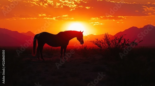 horse, sunset, silhouette, desert, mountain, equine, wildlife, nature, landscape, sky, sun, red, orange, fiery, gold, beautiful, scenic, rural, western, wild, animal, mammal, horizon, cloud, twilight, evening, day, light, shadow, dark, colours, vibrant, warm, hot, image, photo, photo, picture, art