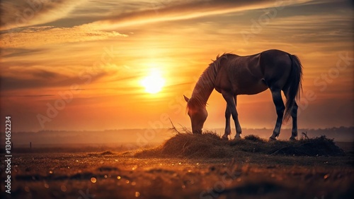 horse, sunset, silhouette, hay, grazing, equestrian, animal, farm, rural, nature, wildlife, photo, documentary, golden hour, landscape, field, agriculture, equine, farm animal, peaceful, serene, calm, beauty, majestic, powerful, strong, elegant, wild, free, countryside, dusk, twilight, shadow, light, art, image, picture, royalty free, download
