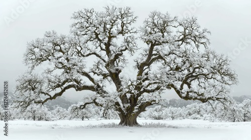 oak, tree, snow, winter, landscape, majestic, branch, cold, glacé, white, nature, scenery, frost, picturesque, serene, beautiful, tranquil, idylli, peaceful, quiet, calm, stillness, solitude, wilderness, rural, countryside, season, weather, climate, environment, ecology, flora, botany, background, image, photograph, art, photo