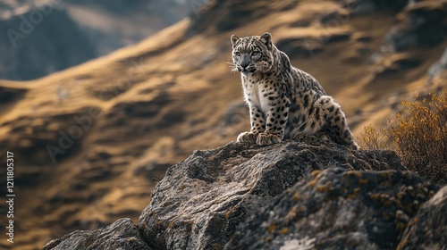 Majestic snow leopard perched on a rocky mountain peak, overlooking a vast, mountainous landscape.