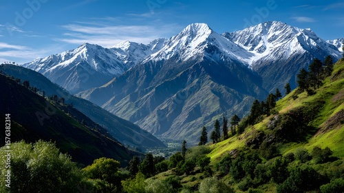 Majestic Snow-Capped Mountain Peaks Above Lush Green Valley Under Clear Blue Sky