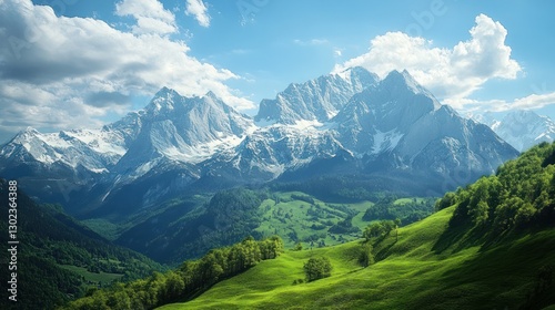 Majestic Snow-Capped Mountain Range Over Rolling Green Hills