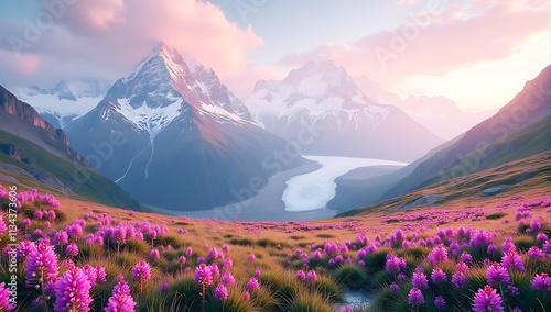 Majestic snow-capped mountains, Colorful sunset sky, Pink and purple wildflowers meadow, Alpine landscape