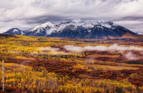 Majestic snowcapped mountains loom over a vibrant autumn landscape with golden yellow and red foliage, under a dramatic cloudy sky