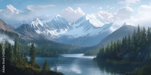 mountain, lake, snow, forest, tree, nature, landscape, scenery, scenic, view, panorama, sky, cloud, water, peak, wilderness, tranquil, serene, calm, peaceful, majestic, beautiful, picturesque, idylli, travel, adventure, exploration, summer, sunlight, blue, green, white, alpine, coniferous, evergreen, fog, mist, vale, horizon, vista, summit, range, hill, timberland, park, wild