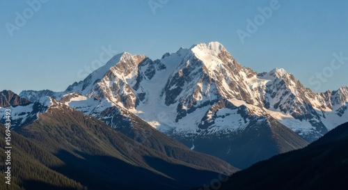Majestic snow-capped peaks under clear blue sky. Soft light illuminates rugged terrain above lush green forests, serene alpine wilderness panorama.
