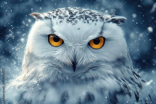 majestic snowy owl portrait with vibrant watercolor splashes and dynamic paint splatters on deep blue background creating artistic wildlife wall art
