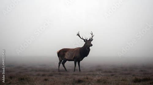 Majestic Stag Silhouette on Misty Moor – Foggy Landscape with Dramatic Lighting in Mystical Scottish Highlands