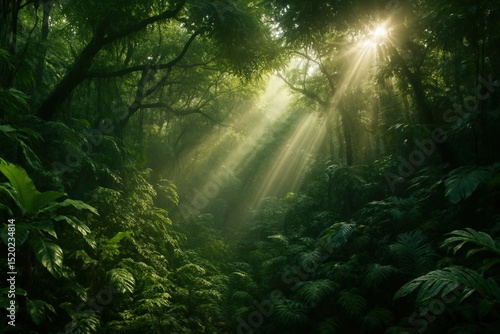 Majestic sunlit jungle canopy with tree foliage and sunbeams