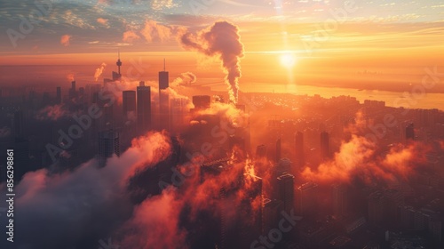 sunrise, city landscape, skyline, cloud, golden hour, skyscraper, urban, majestic, morning, dawn, sunlight, aerial view, highrise, metropolis, beautiful, atmospheric, stunning, fog, architecture, city, landscape, breathtaking, scenic, dramatic