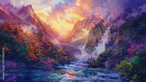 Majestic sunset over a serene valley with colorful foliage and cascading waterfalls, reflecting nature's beauty