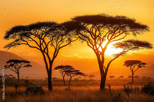 Majestic sunset over acacia trees in an African savannah, showcasing vibrant colors and wildlife silhouettes
