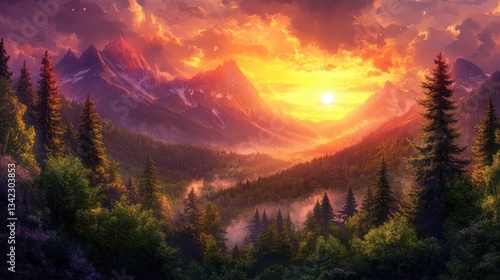 mountain, sunset, landscape, nature, forest, tree, sky, cloud, sun, gold, orange, red, scenic, view, beautiful, serene, peaceful, tranquil, calm, majestic, awesome, breathtaking, spectacular, amazing, picturesque, idylli, stunning, gorgeous, grandiose, sublime, alpine, wood, coniferous, evergreen, fir, pine, twilight, horizon, panorama, art