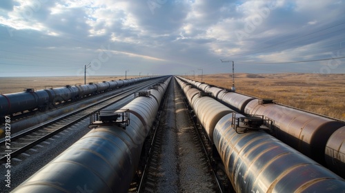 majestic, sunset, over, rail, yard, oil, tanker, train, railway, vibrant, sky, dusk, transportation, transport, industrial, railroad, evening, cargo, freight, crude oil, logistic, dramatic, cloud, colours, infrastructure, energy, industry, stationary, track, converging, steel, wheel, line, orange, blue, twilight, fuel, scene, ground