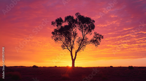 sunset, tree, silhouette, landscape, orange, pink, sky, nature, photo, scenic, view, australian, outback, vibrant, colours, majestic, beautiful, serene, peaceful, calm, tranquil, dramatic, gold, red, cloud, horizon, field, grass, light