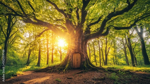 Majestic tree with vibrant green leaves and a wooden door embedded in its trunk, glowing in golden sunlight.