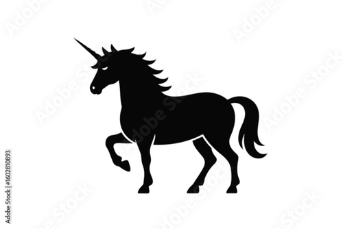 unicorn, silhouette, horse, fantasy, magical, elegant, profile, standing, mane, tail, black, white background, outline, simple, iconic, creature, legend, folklore, animal, equine, stylised, graphic, design
