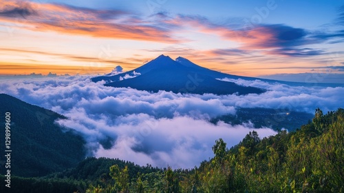 volcano, sunrise, mountain, cloud, landscape, scenic, view, nature, travel, panorama, sunset, misty, mountainous, peak, cloudscape, forest, summit, mountain, adventure, trekking, hiking, outdoors, viewpoint, vacation, explore