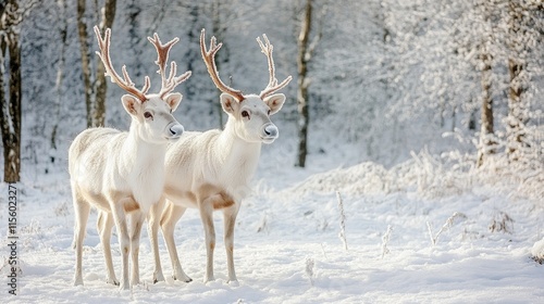 Majestic White Reindeer in a Snowy Forest Landscape Scene