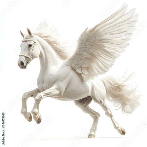 Majestic white winged horse, Pegasus, in flight, isolated on a white background