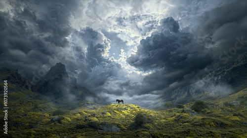 wild, horse, render, digital, artwork, stormy, sky, rugged, landscape, sense, freedom, power, untamed, spirit, nature, dramatic, perspective, storm, cloud, lighting, dynamic, composition, atmosphere, weather, dark, majestic, strength, surreal, element, wilderness, breathtaking, scenery
