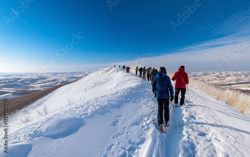 adventure, nature, sky, hiking, hiker, snow, landscape, beautiful, peak, view, cold, travel, sunny, people, snowshoe, trekking, mountain, blue, scenic, winter