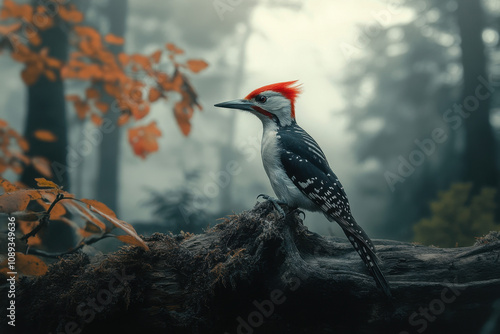 Majestic woodpecker perched on a mossy log in a misty autumn forest, vibrant red crest contrasting with muted foliage.
