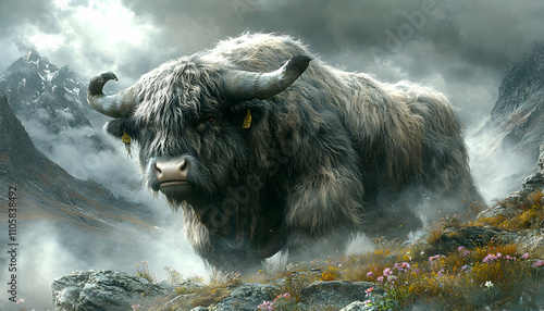 Majestic yak standing in misty mountain landscape.