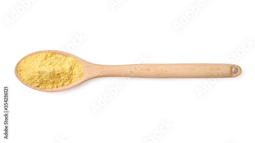 Mąka kukurydziana na drewnianej łyżce, wyizolowane białe tło