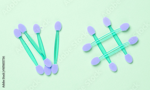 Makeup applicators in hashtag form on a blue background
