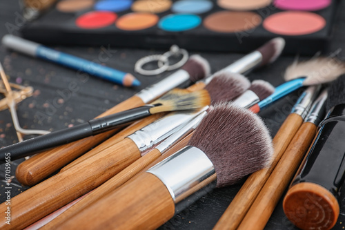 Makeup brushes on table. Professional visage artist set