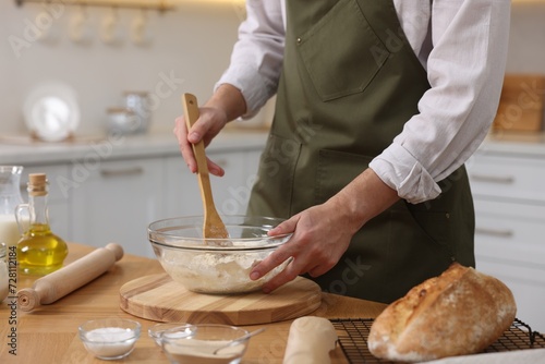 Making bread. Man preparing dough in bowl at wooden table in kitchen, closeup