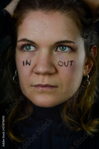 making decisions - portrait of a beautiful blonde woman with the words in and out written on her cheeks and looking away