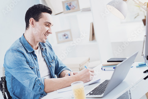 Making notes. Joyful brunette keeping smile on his face while sitting in semi position