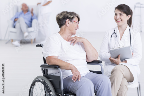nursing home, care, caregiver, carer, doctor, elder, elderly, senior, nurse, help, assistance, adult, old, hospital, health, professional, retirement, health care, wheelchair, talking, happy, smiling