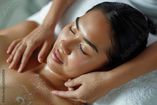 Malay woman enjoying massage at spa salon hotel, therapist treatment